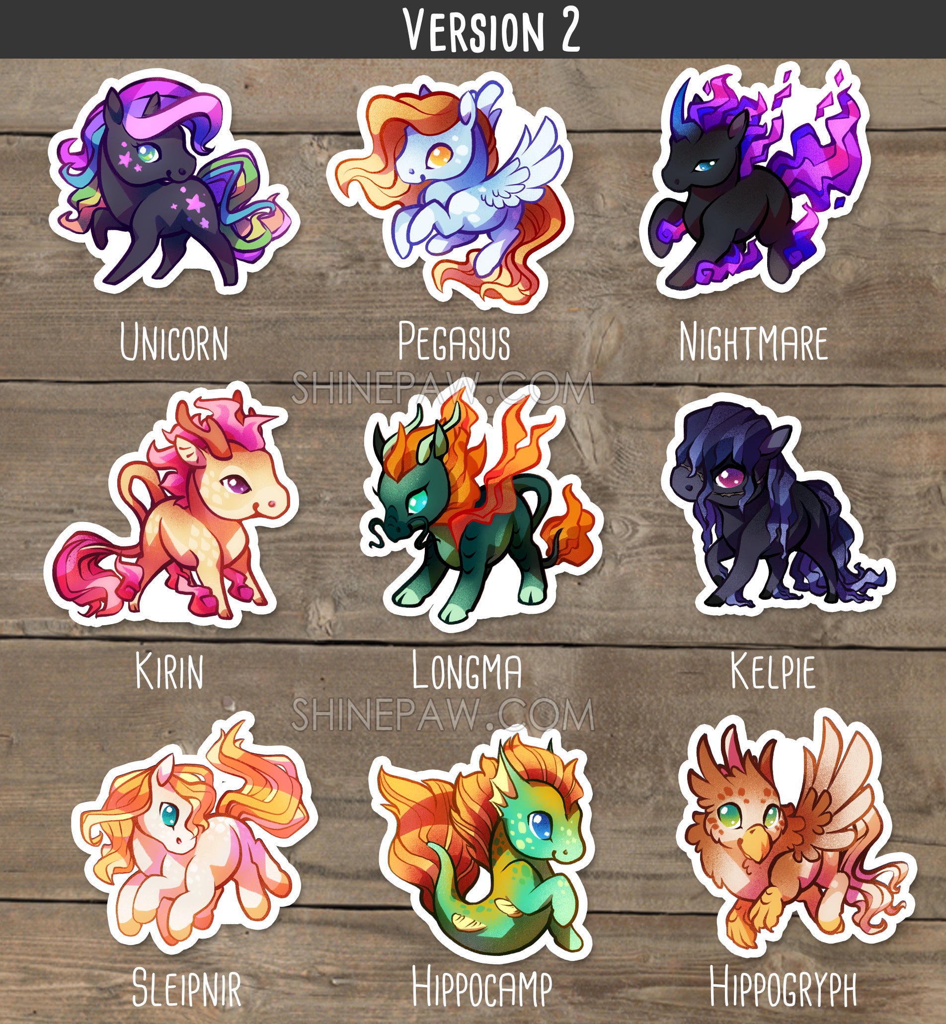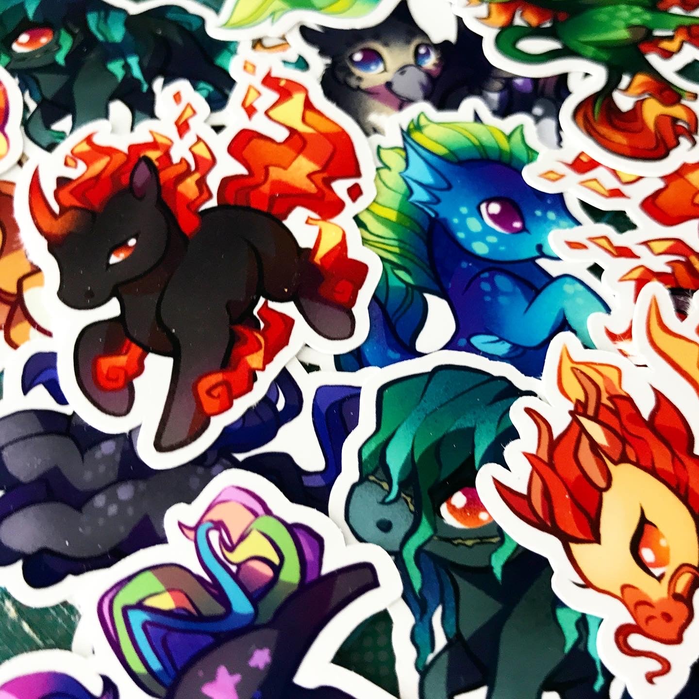 Cute and nicely drawn Fantasy Equine stickers for all your needs! These stickers are hand cut and printed on durable, glossy vinyl. Stick them to anything, they are water resistant and can be removed cleanly.